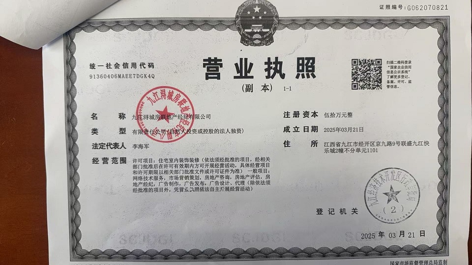 | 公司名称 | 九江浔城房联地产经纪有限公司 | 工商执照号 | 91360406MAEE7DGK4Q |