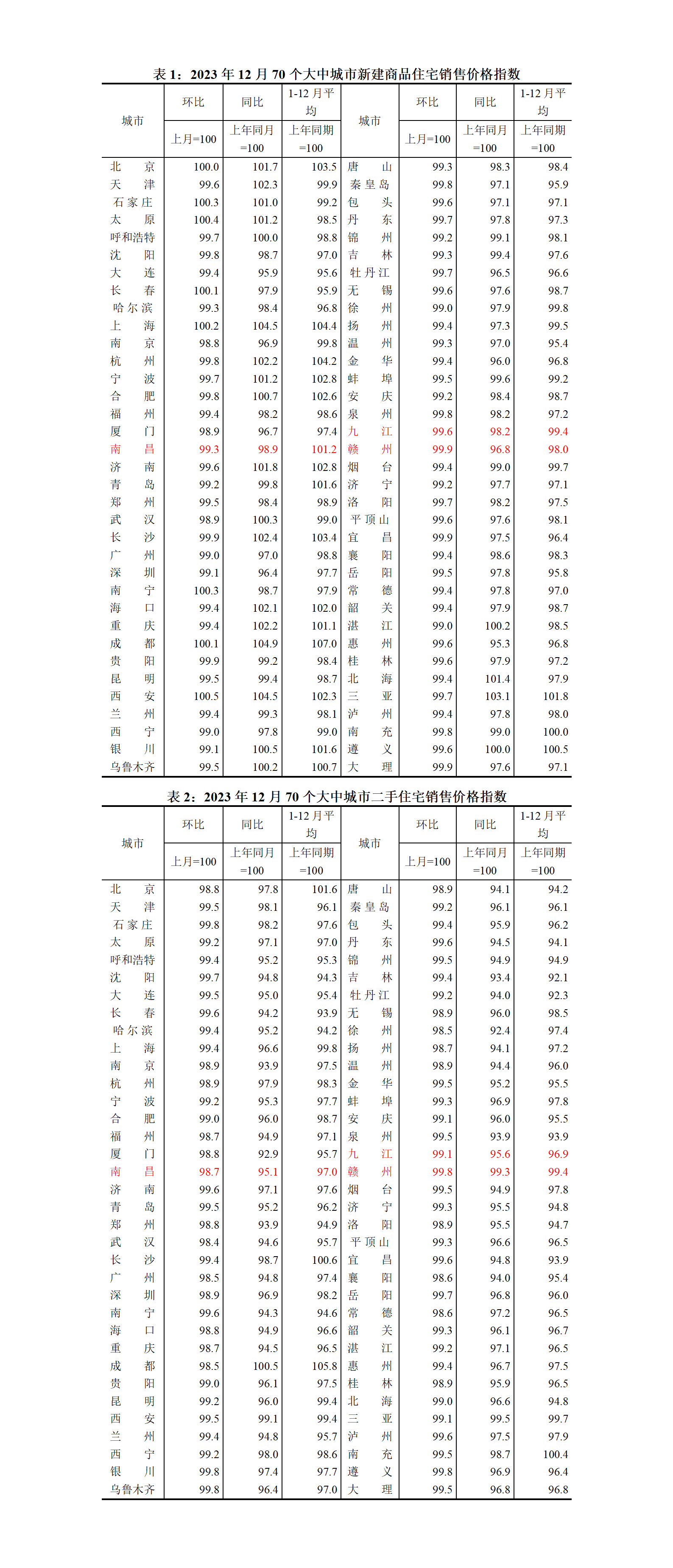 2023年12月,南昌新建商品住宅价格指数环比下降0.7%,同比下降1.1%;赣州环比下降0.1%,同比下降3.2%;九江环比下降0.4%,同比下降1.8%。